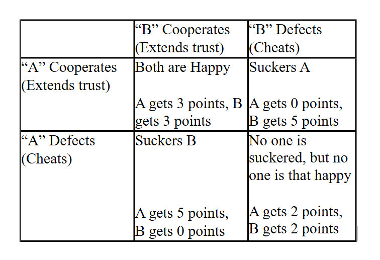 Suppose two early humans lie down next to each other in the Serengeti for a night. They have the option of being friends or enemies, and neither knows which option their neighbor will choose. If they both extend the hand of trust and doze off next to each other unguarded, they both sleep soundly through the night and wake up well rested with all their possessions intact (let’s say 3 points each in our game). If one of them however decides to “defect” from this relationship of trust and exploit the other’s gullibility by waiting until he is asleep and then stealing his bow and arrow (and maybe even slitting his throat), then he literally makes off like a bandit (5 points for the bandit and 0 points for the sleeping victim). Of course, if both cavemen defect and lie awake with plans to attack each other in the night, then 1) Neither can steal each others possessions, because they are both on guard, but 2) Neither gets any sleep because they need to keep one eye open (let’s say 2 points each)